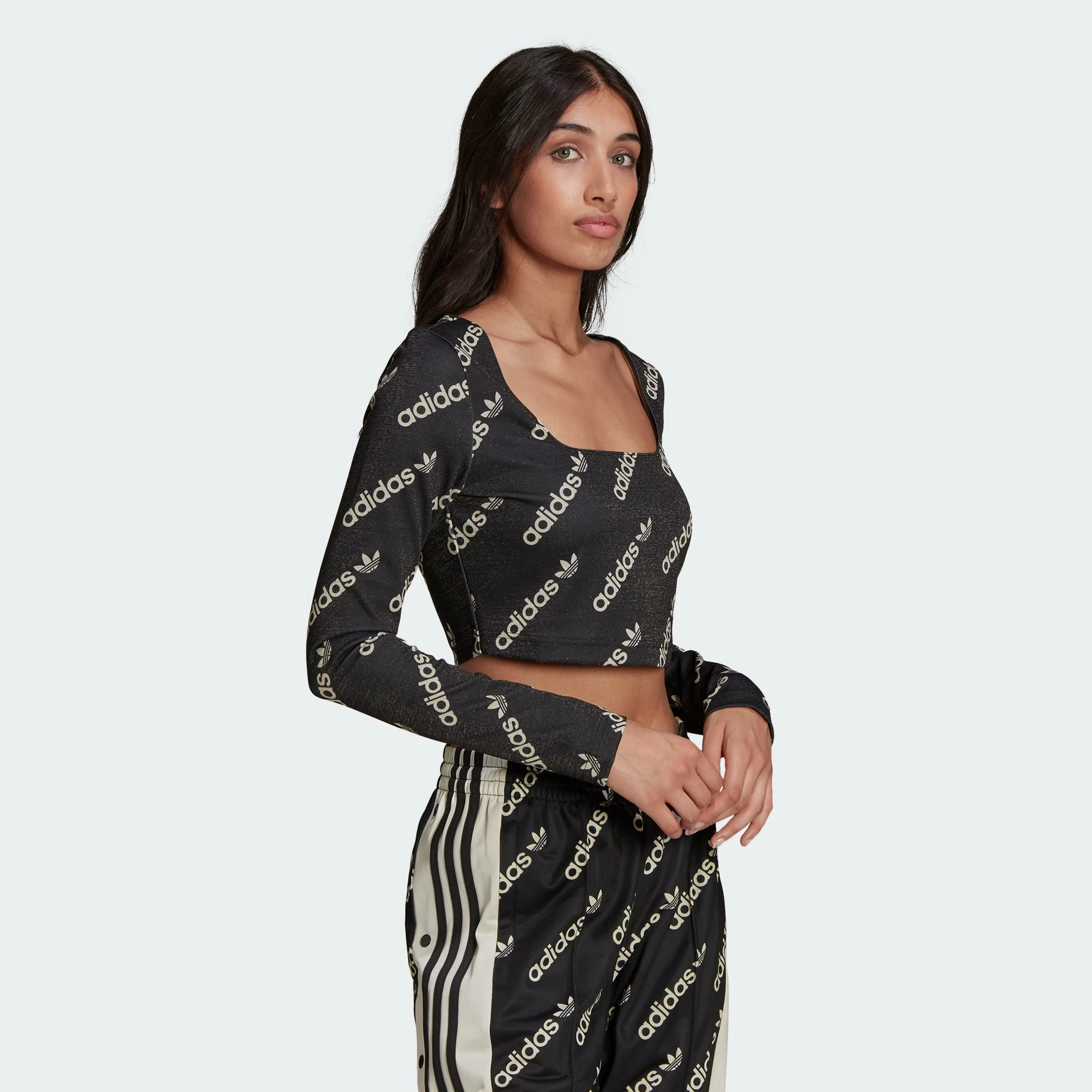Show off your love for the brand with the adidas Long Sleeve Crop Top. The top comes designed with a slinky fabric that shimmers with monogrammed logos all around. Comes perfectly cropped.
