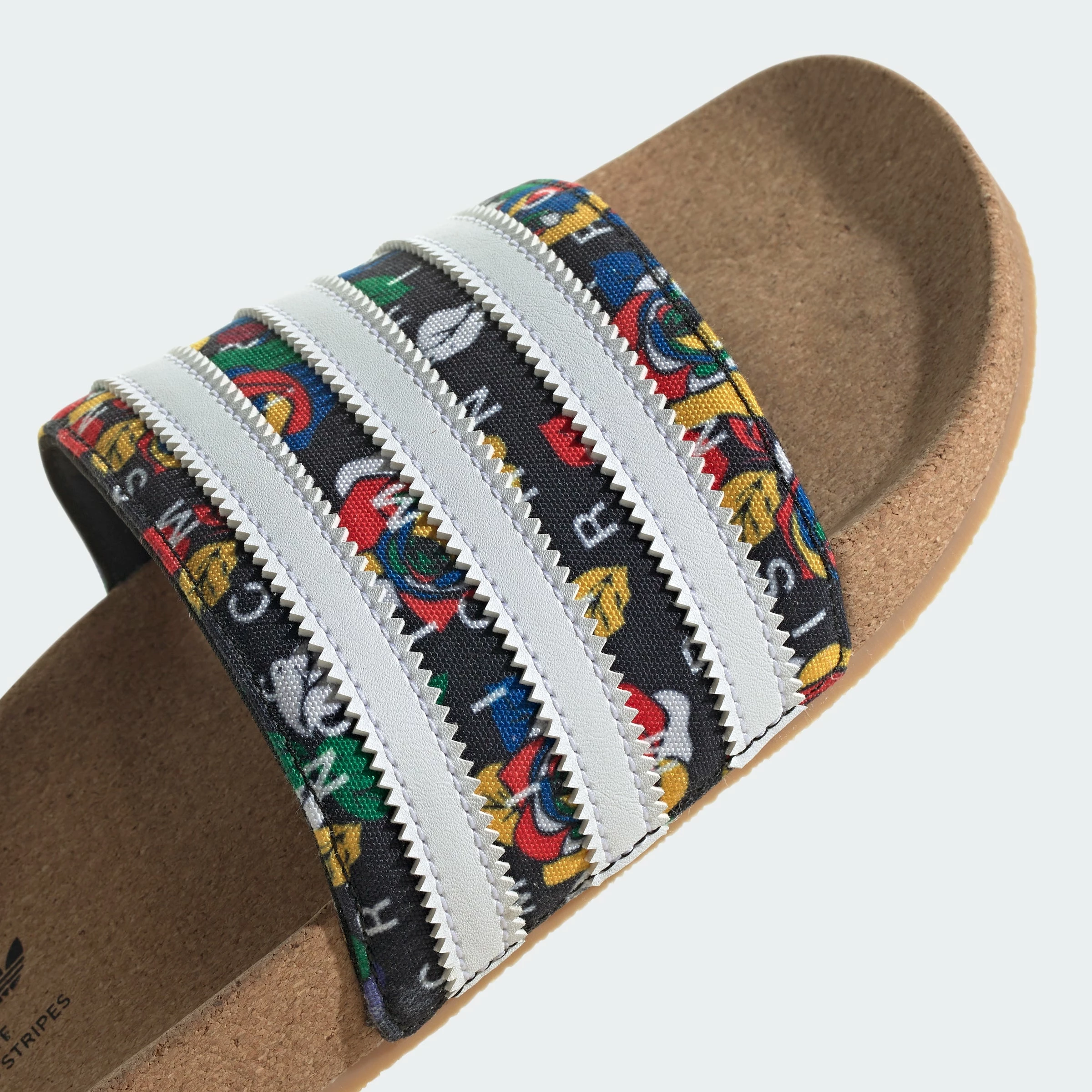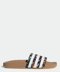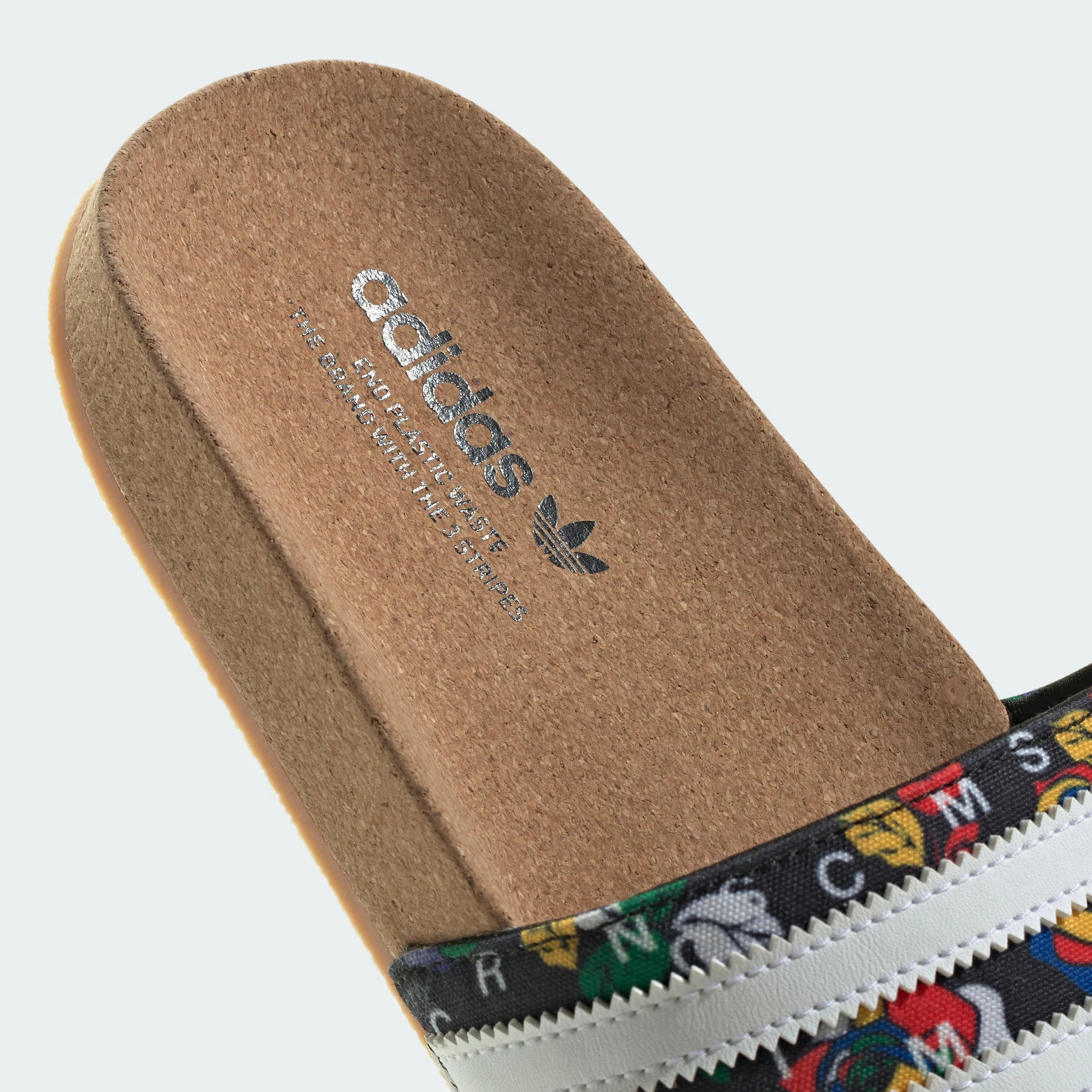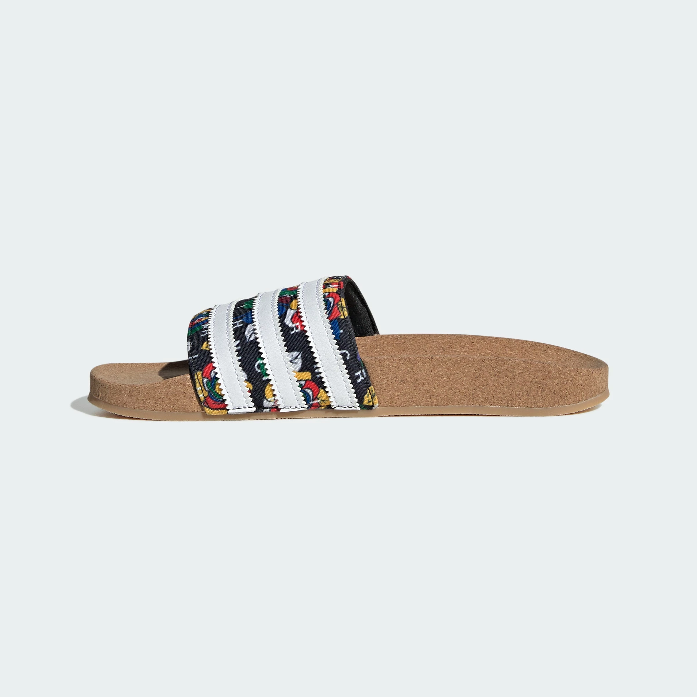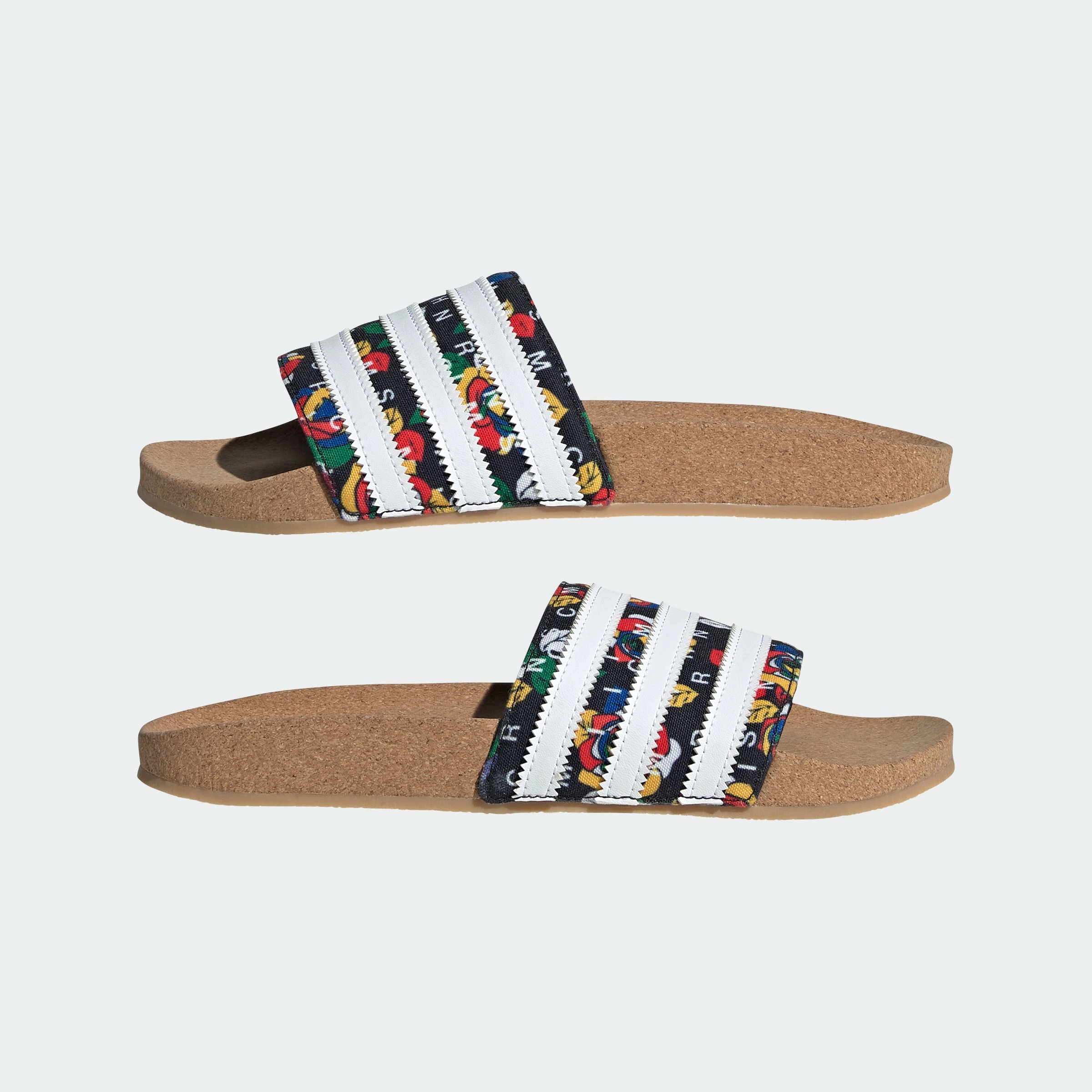 Kick off the heels and swap ’em out with your favorite adidas slides. These Adilette slides feature colorful rose graphics by South African designer Rich Mnisi with adidas 3-Stripes that line the tops in white. The unique footbed is made of cork.