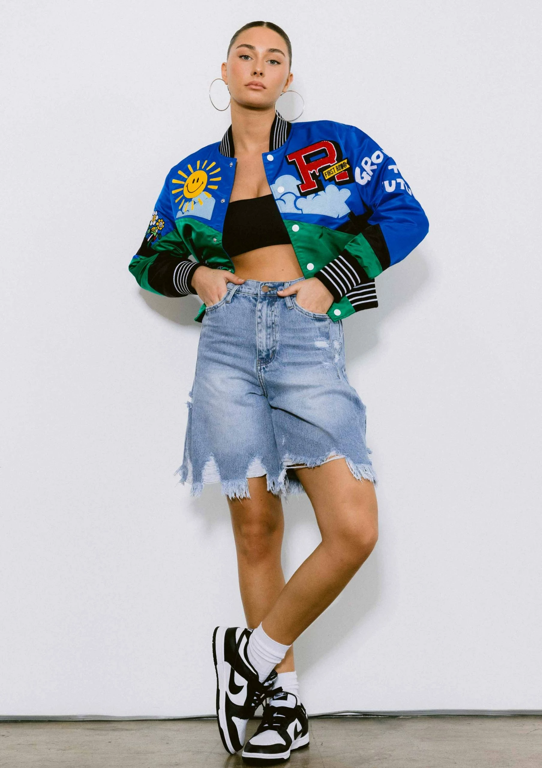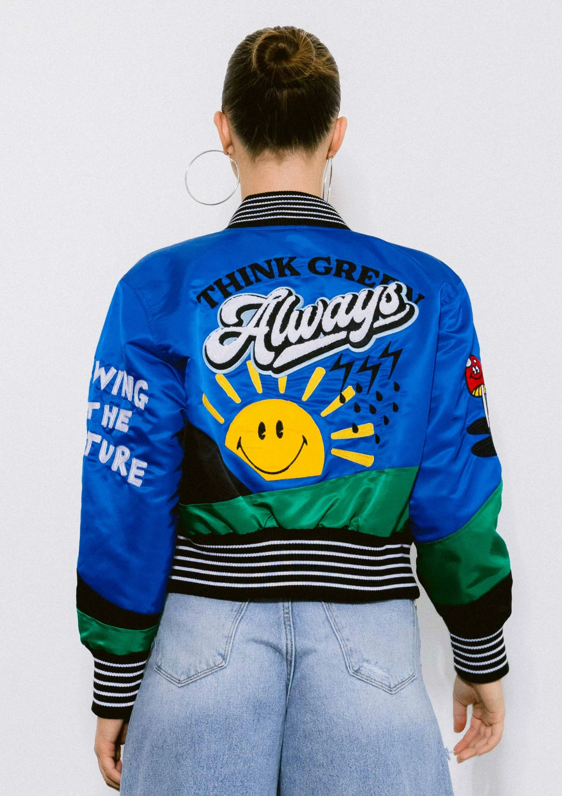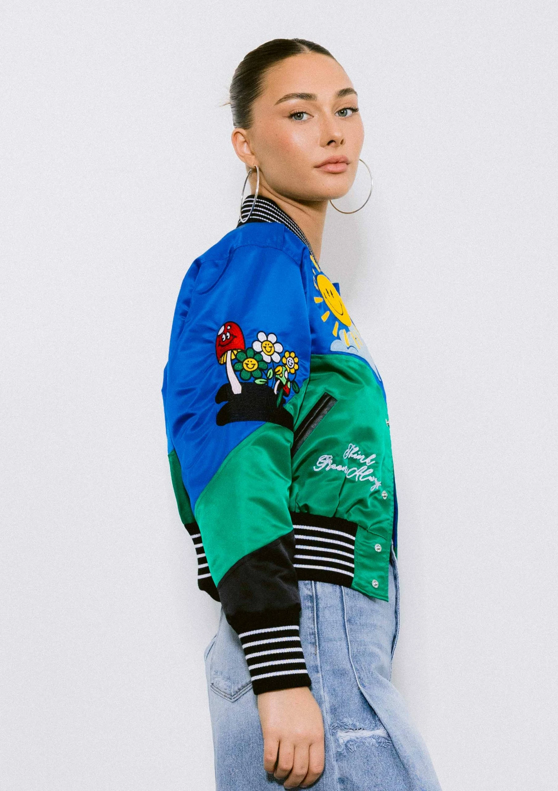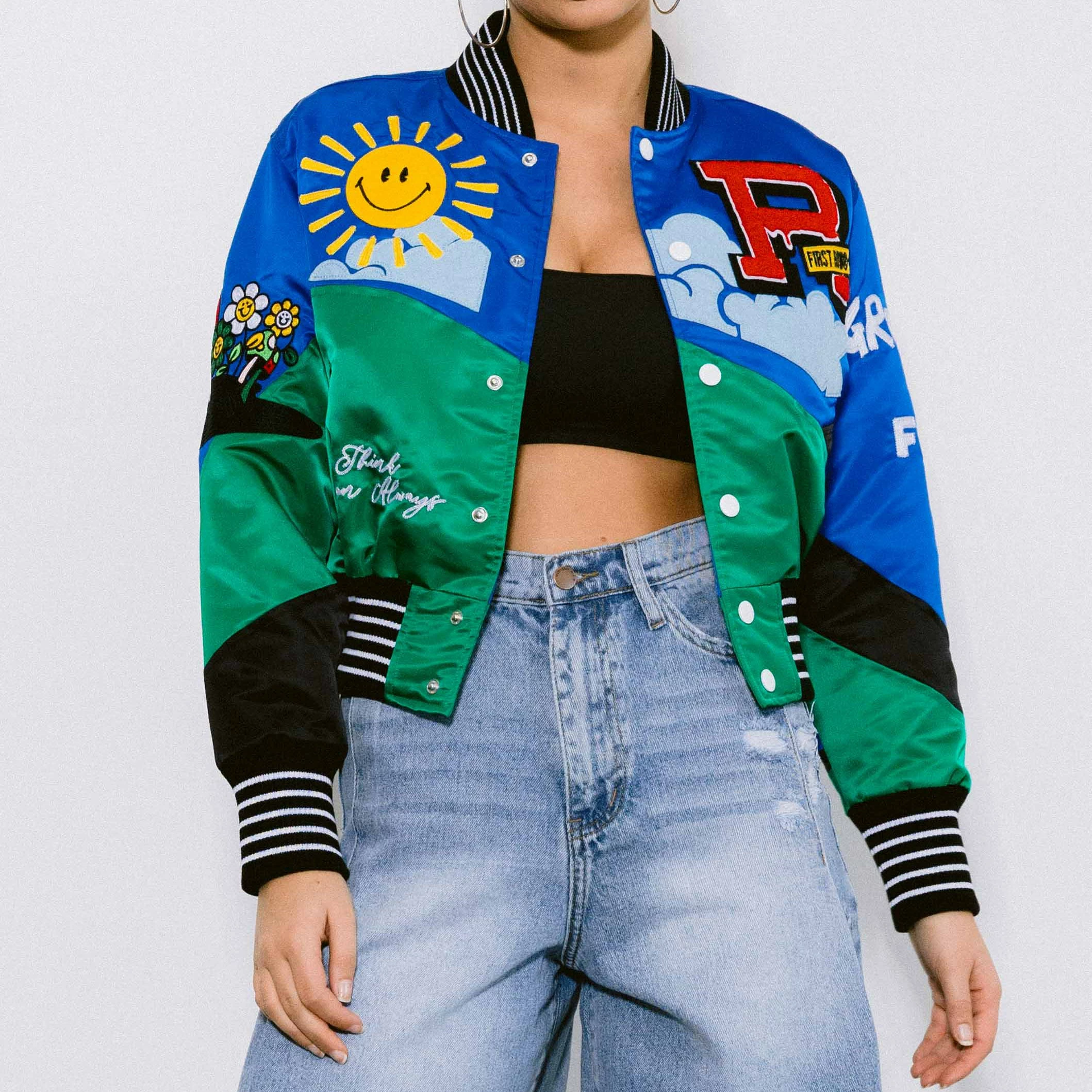 Be good to the earth with an inspiring retro statement piece. The First Row Think Green Varsity Jacket comes cropped with contrast faux-leather sleeves. Designed with playful chenille patches on front and back. Closes via snap buttons in front. Makes for a sporty fit with your latest jean and sneaker cops.