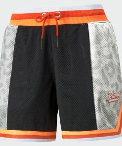 Shoot some hoops with the PUMA Swish Maker Printed Basketball Shorts. The lightweight mesh shorts feature eye-catching colorblocks and allover print design. Gives off a vintage vibe with the retro PUMA logo. Comes with pockets on the sides and drawcord to adjust the waist just right.
